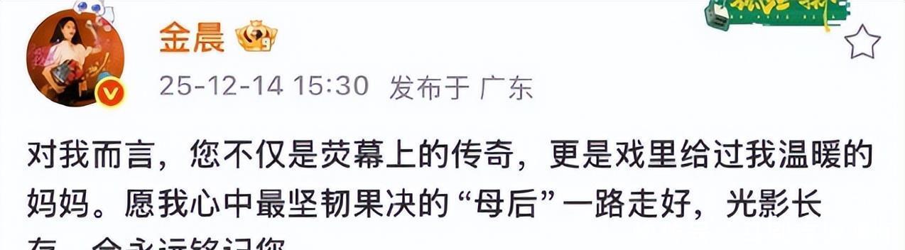 而和何晴在《女医明妃传》中饰演一对母女的演员金晨也发文悼念何晴。金晨直言,对自己而言,何晴不仅是荧幕上的传奇,更是戏里给过自己温暖的妈妈,愿自己心里最坚韧果决的“母后”一路走好。