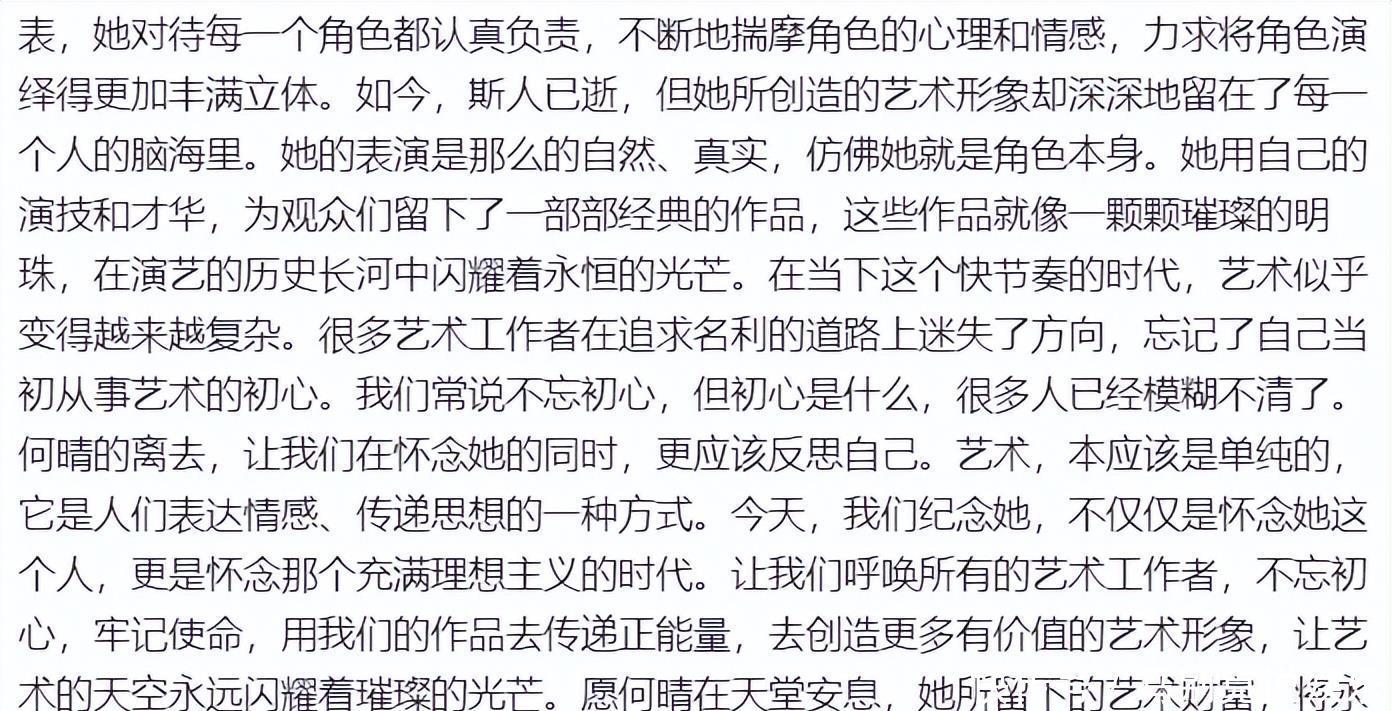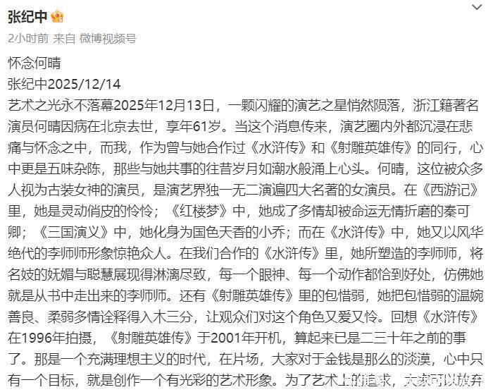 其中曾在《水浒传》和《射雕英雄传》中两度和何晴合作的导演张纪中,发千字长文悼念何晴。文中他先是回顾了何晴和自己合作的两部戏,以及出演四大名著中的每个角色的表现,都是那么的出彩,那么地恰到好处。直言和何晴当年合作的往事如潮水般涌上心头。
