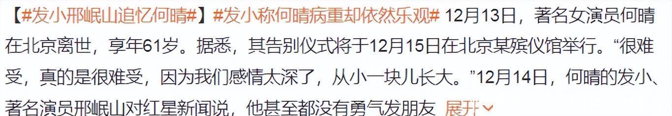 演员邢岷山和何晴是发小,两人从小就在昆剧团学戏,他回忆和何晴年少时点滴,称何晴病重时依然乐观,会用自己方式悼念她。